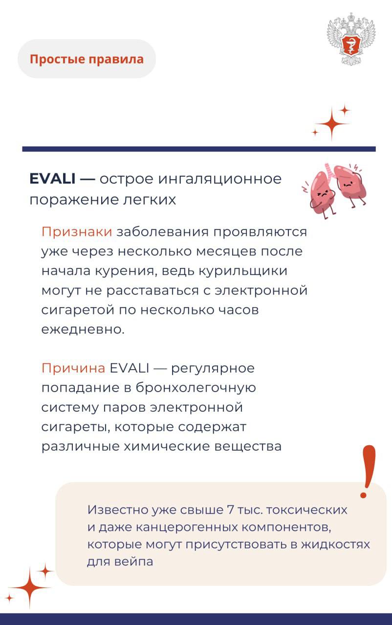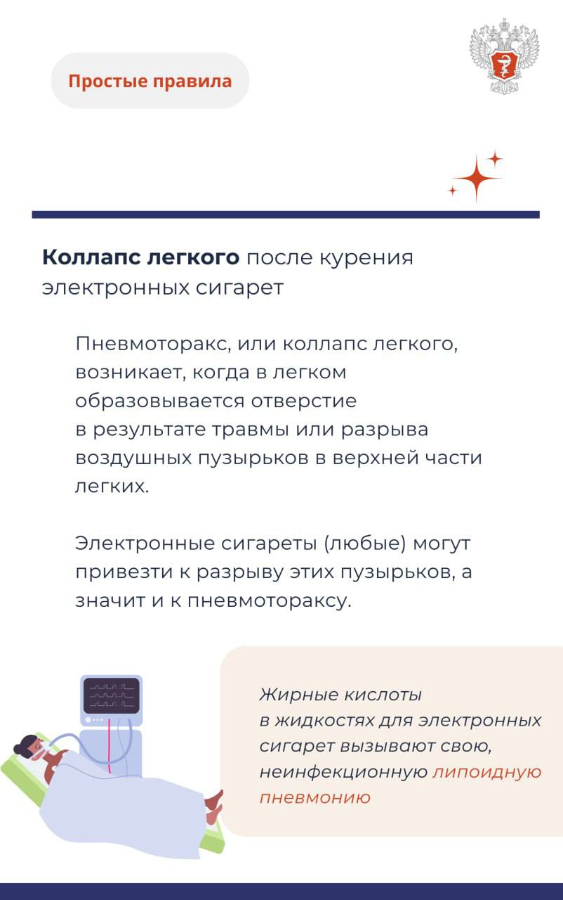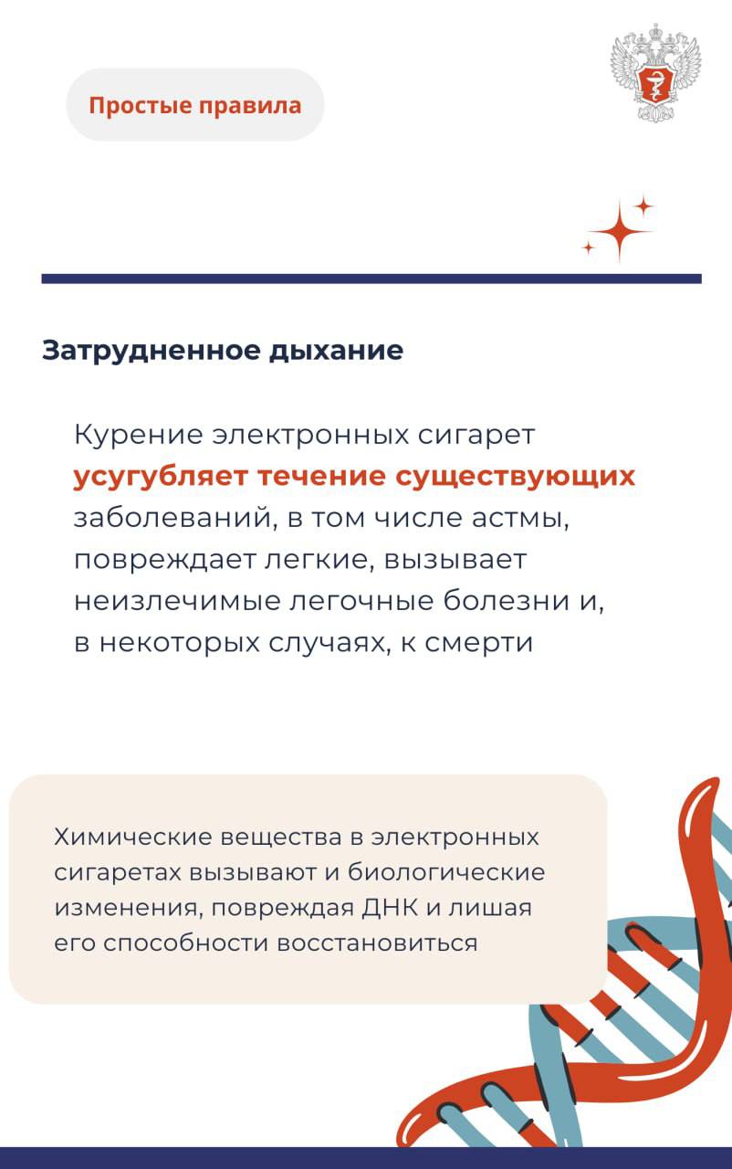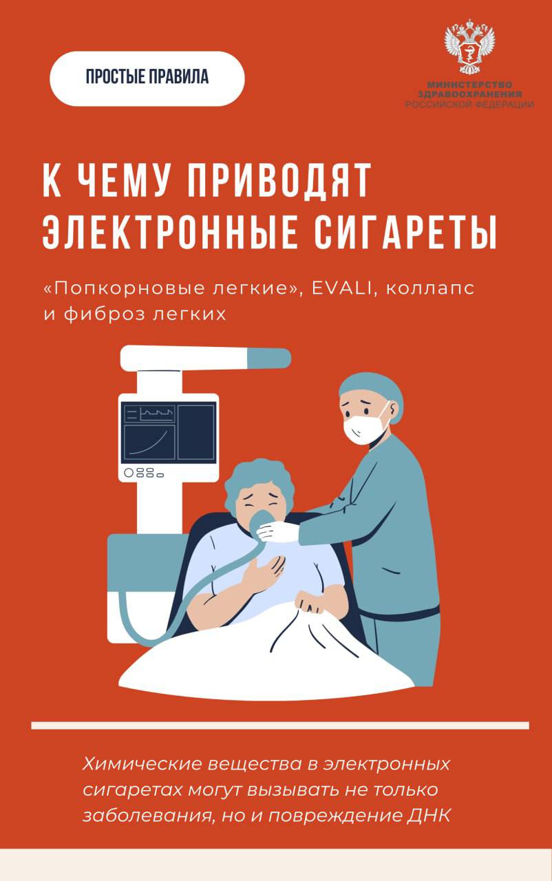 Курение электронных сигарет также усугубляет течение астмы и других заболеваний легких, повышая вероятность сердечно-сосудистых патологий и мутаций ДНК. Подробнее о заболеваниях, вызываемых курением электронных сигарет смотрите в карточках Минздрава России