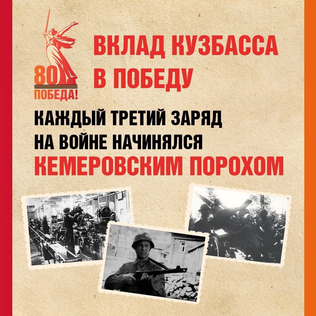 В годы Великой Отечественной войны экономика Кузбасса претерпела значительные изменения. На территории региона было размещено оборудование 97 эвакуированных предприятий, на основе которого впоследствии было построено 33 новых завода. Среди них: — 11 заводов в Кемерово; — 6 заводов в Новокузнецке; — по 3 завода в Прокопьевске, Ленинске-Кузнецком и Анжеро-Судженске; — по 2 завода в Киселевске и Белово; — по одному заводу в Юрге, Топках и Промышленной. Рабочие заводов занимались отливкой корпусов для мин, изготовлением зарядов для гаубиц и патронов для винтовок. Каждый третий снаряд, включая знаменитые «Катюши», был наполнен кемеровским порохом.