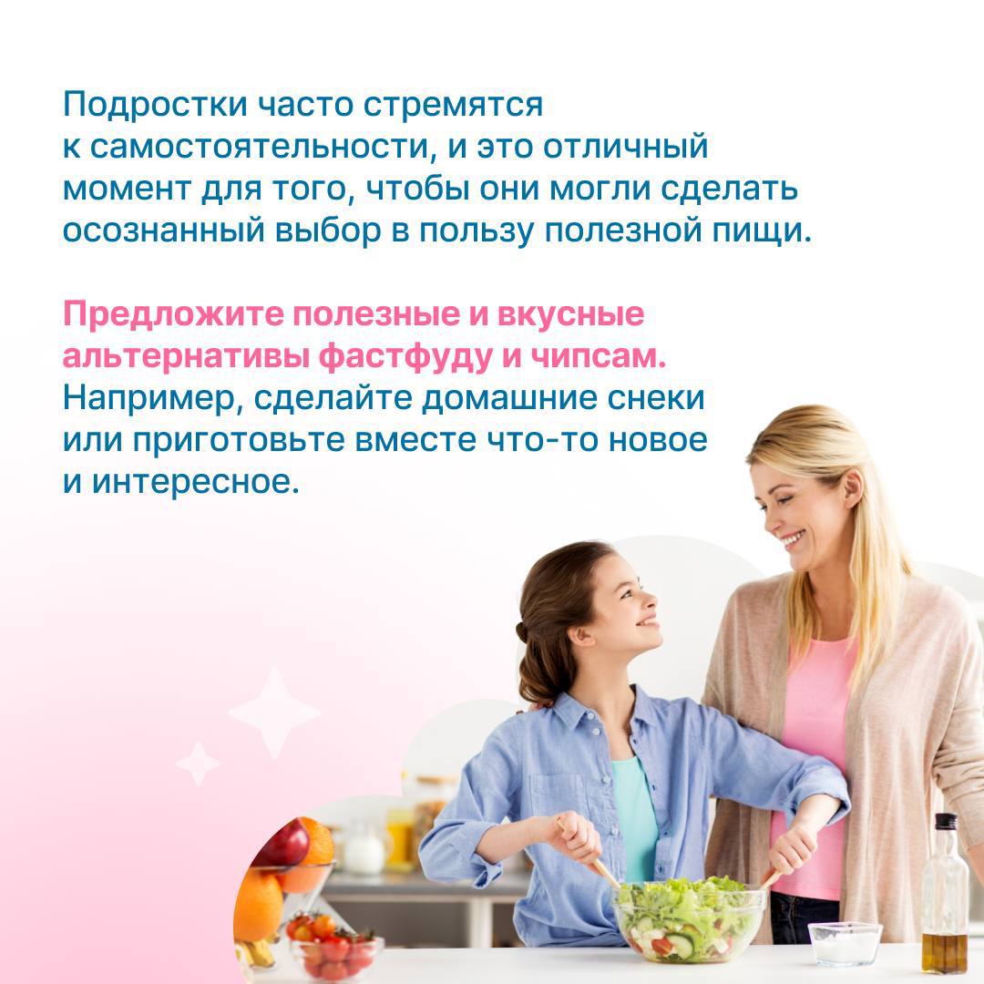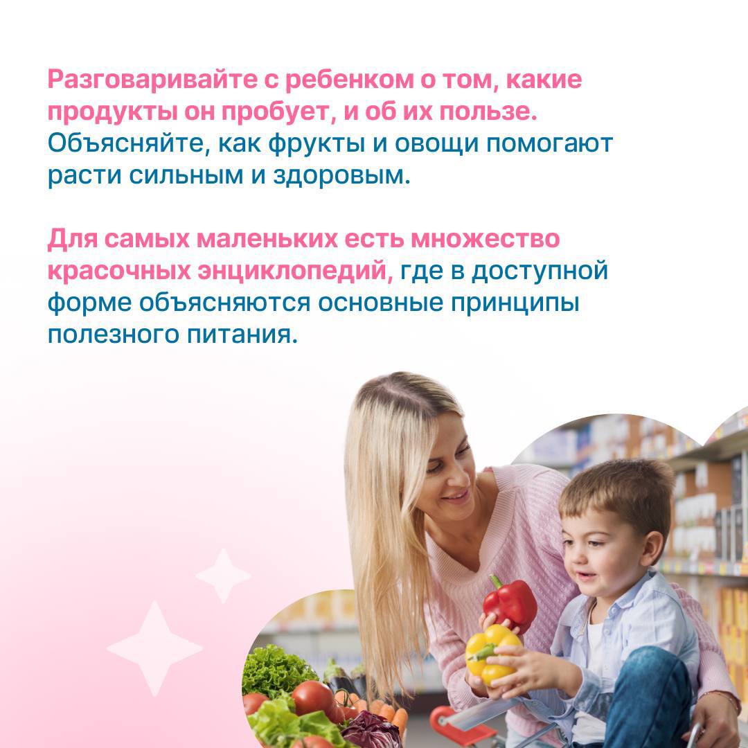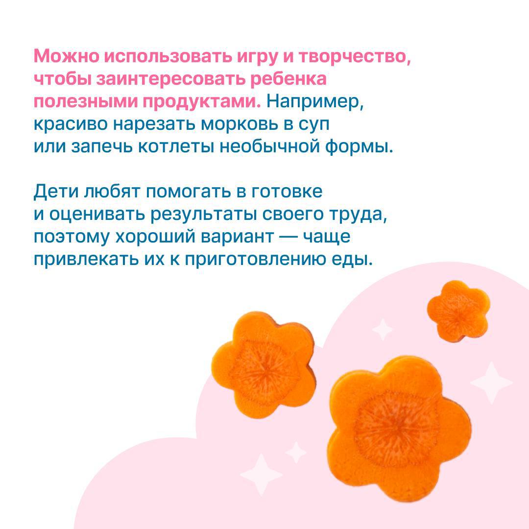 В зависимости от возраста подходы к формированию этих привычек могут немного отличаться. Малыши учатся через игру и подражание, а подростки стремятся к самостоятельности и осознанному выбору. В карточках — несколько идей, которые помогут вам воспитать у детей разного возраста любовь к здоровой пище.